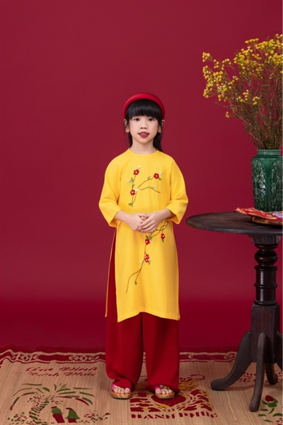 Áo dài em bé đũi cổ tròn thêu hoa mai