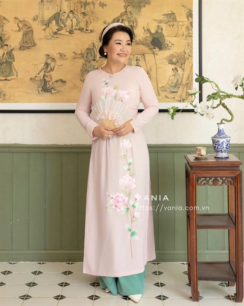 Áo dài người lớn vẽ hoa sen kết cườm cổ