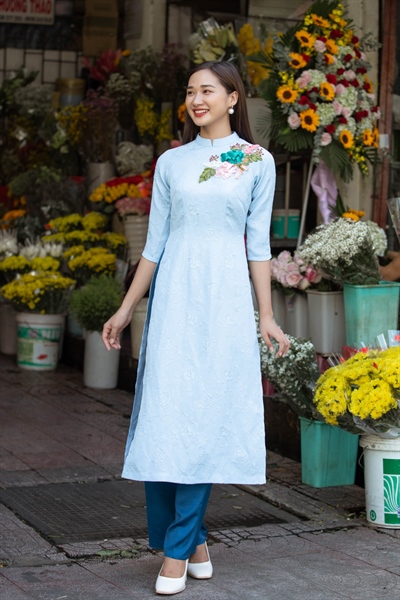 Áo dài gấm tay phồng Ngọc Lam
